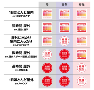 ヒートテックに「ノーマル」「極暖」「超極暖」があるように、服にはそれぞれ“耐えられる気温”があります。